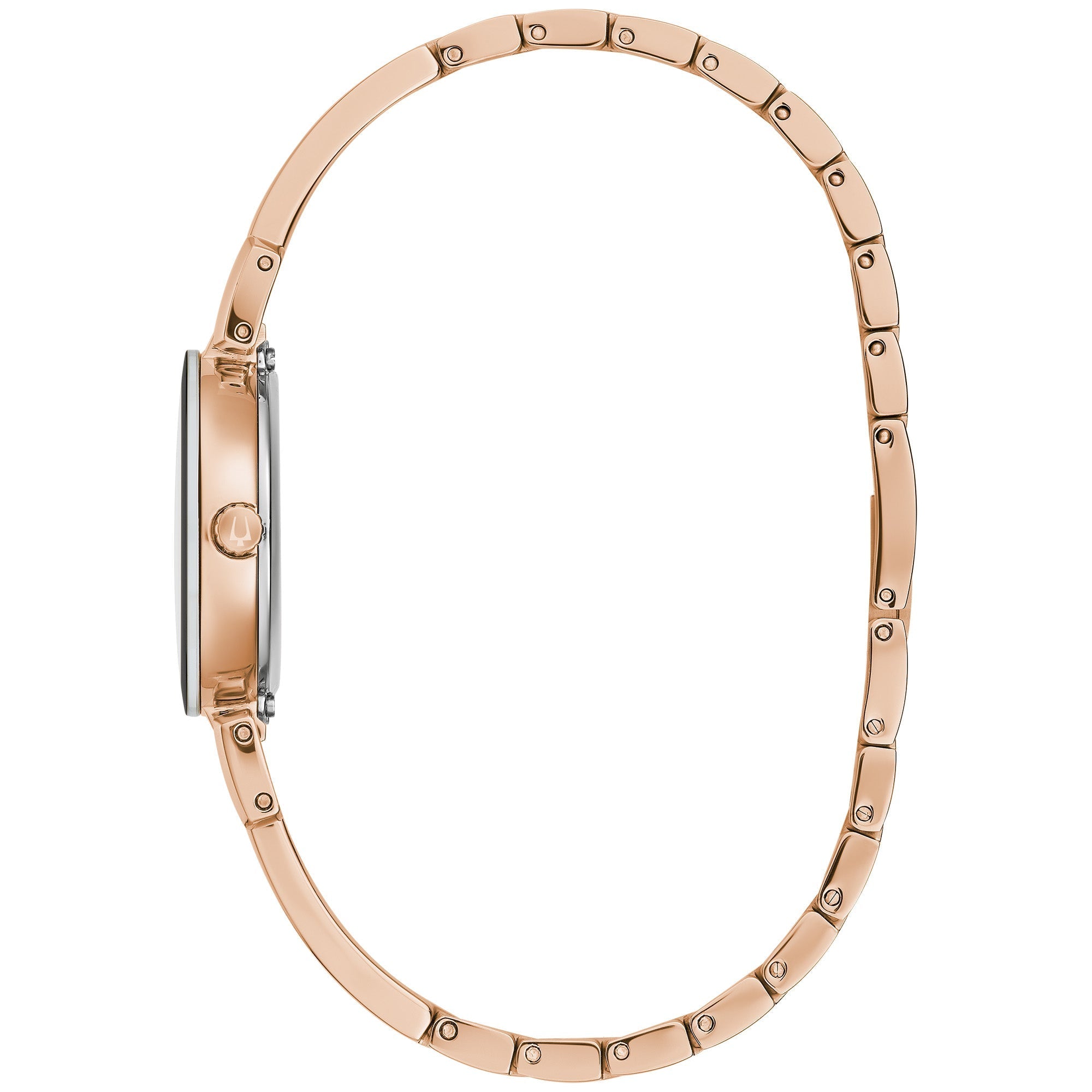 Bring the romance of Marc Anthony’s music to the wrist in this essential accessory that unites Bulova’s fine watchmaking and Marc Anthony’s iconic music in an exclusive collaboration. The new Bulova Marc Anthony Modern Bangle ladies’ watch highlights Bulova’s timeless design with a touch of Anthony’s styling. The rose gold-tone stainless steel case features bold contemporary lines and has a black metalized mineral crystal that extends to the edge for a seamless silhouette. A black mother-of-pearl dial is accented with three diamond hour markers at 1, 3, and 5 o’clock, numbers chosen by Anthony for their personal significance. The case back features an engraving chosen by Anthony: “Valió la Pena” (It was worth it.). A polished rose gold-tone stainless steel bangle bracelet is connected by unique faceted links, completing the striking look of this timepiece. Marc Anthony’s music transcends time, and this elegant, modern women’s watch from Bulova expresses a timeless style.