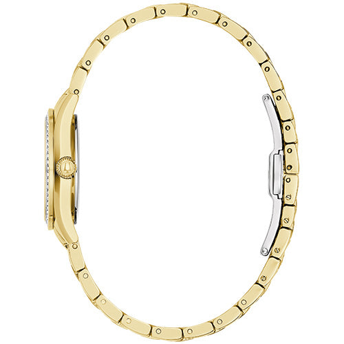 This new addition to the Bulova ladies’ Crystal collection balances a dressy aesthetic with sporty versatility. The gold-tone stainless steel case has a polished bezel fully set with dazzling crystals that complement the dial and bracelet. The opalescent mother-of-pearl dial features gold-tone hands with luminescent fill, polished gold-tone Roman numerals, and hand-set crystal hour markers. The watch is complemented by a gold-tone stainless steel bracelet adorned with crystals, and a deployant push-button closure. Set with 128 crystals, this ladies’ Bulova timepiece expresses radiant beauty.
