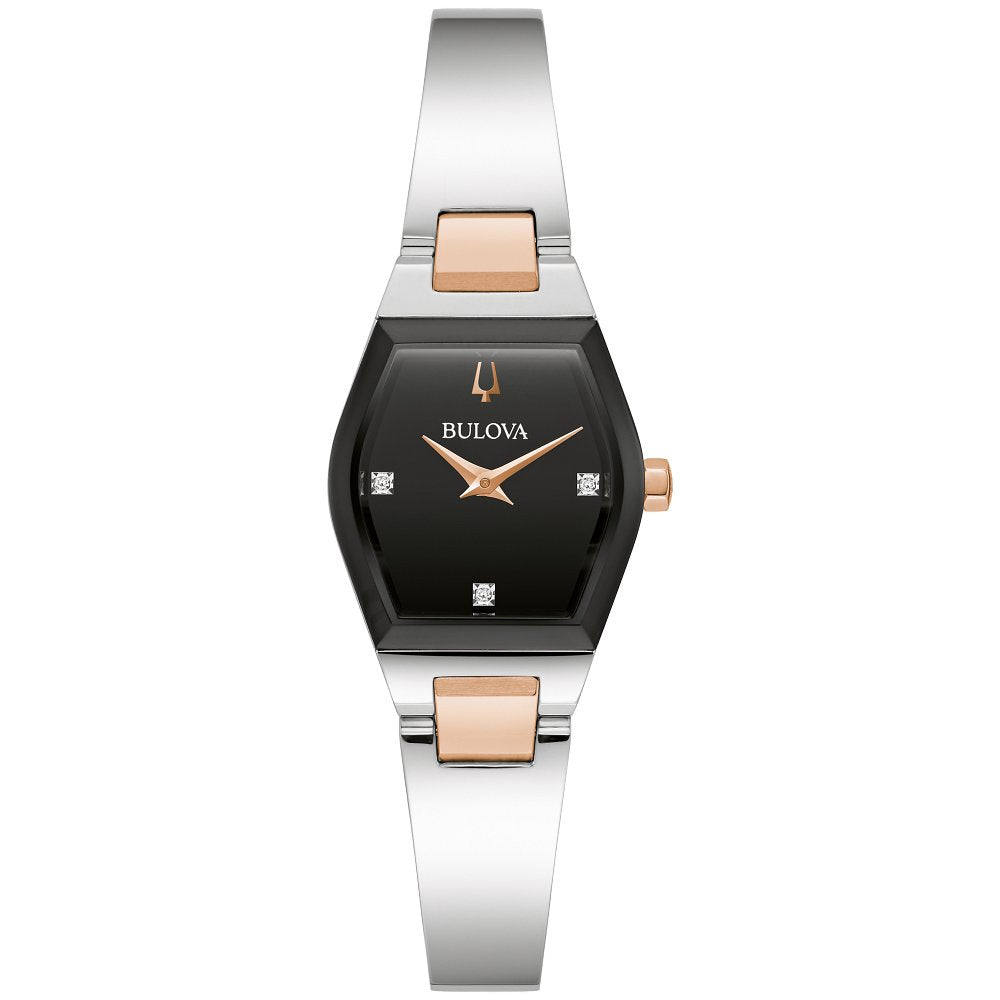 Exceptionally modern and uniquely refined, this distinctive women’s timepiece from the Bulova Gemini Collection is designed to make a statement. The silver- and rose gold-tone case features a sleek edge-to-edge faceted metalized mineral crystal in black, creating stunning depth that transitions seamlessly to the black dial. The dial features gold-tone accents with beveled hands and three hand-set .8mm?? diamonds. The watch is perfectly paired with a bangle-style silver- and rose gold-tone bracelet with a jeweler’s clasp closure. A strikingly sophisticated take on contemporary design, this Bulova women’s timepiece adds instant elegance to any outfit.