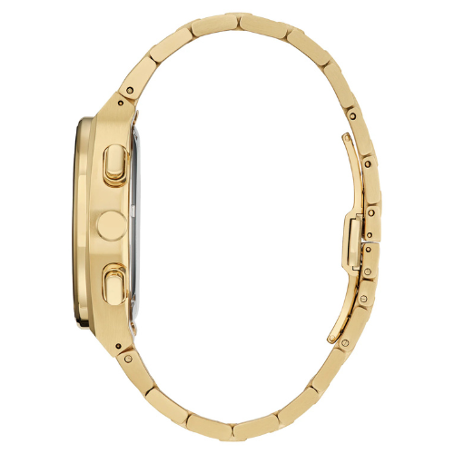 The timepiece features a gold-tone stainless steel case with an integrated stainless steel bracelet, epitomizing the contemporary sports watch design. The black dial has a streamlined look with two sub-dials at 3 and 9 o’clock, outlined with silver-tone details to match the silver-tone indices and hands. Capabilities of the watch include a 1/5 second chronograph that measures up to 60 minutes, 12- and 24-hour time indication, and a date indicator. Powered by Citizen’s proprietary Eco-Drive technology to provide light-powered vitality continuously and sustainably without ever needing a battery. Caliber B620.