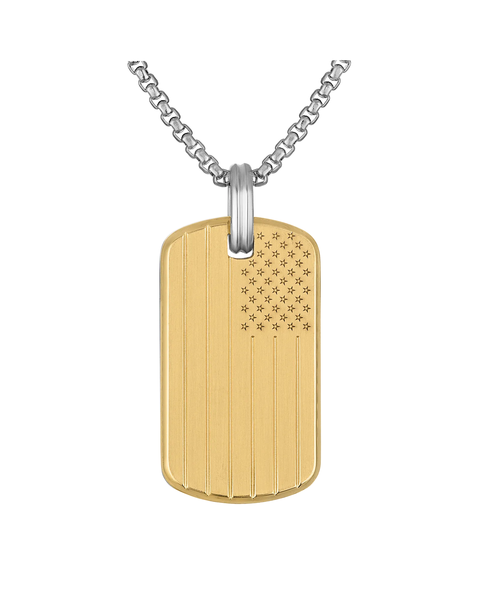 Representing the intertwining of Bulova's history with American culture, this double-sided dog tag pendant celebrates both the American flag and Bulova's 150 Year Anniversary. Made of two-tone matte finish stainless steel, the front side proudly features an etching of the stars and stripes, with 150BULOVA™ etched on the reverse. Rounded box link chain necklace in stainless steel adjusts from 24" to 26" with extender ring and tuning fork clasp. Pendant measures 38MM L x 21MM W.