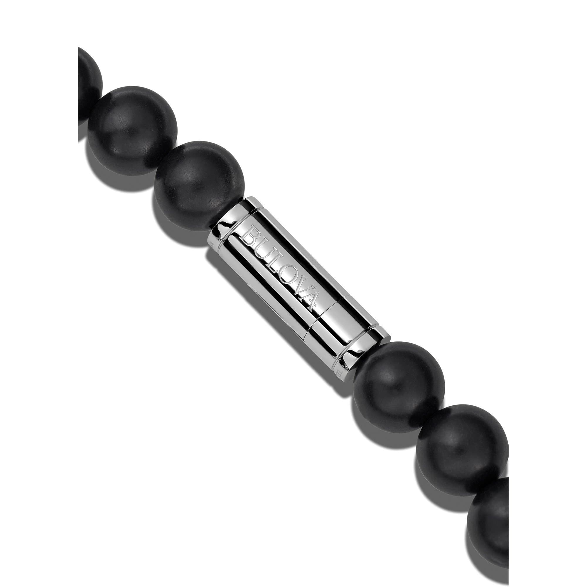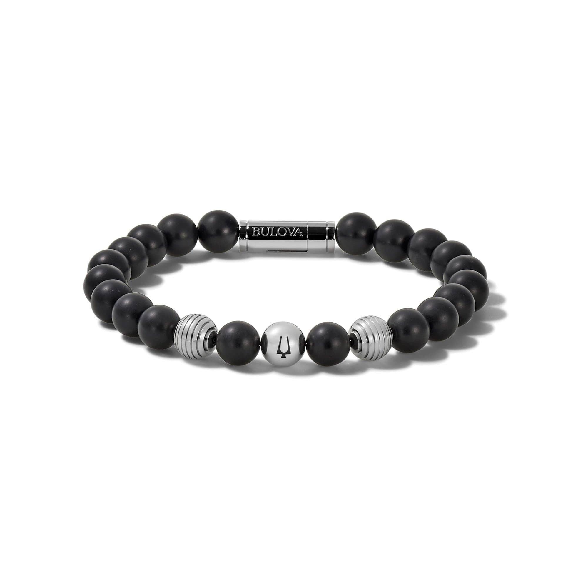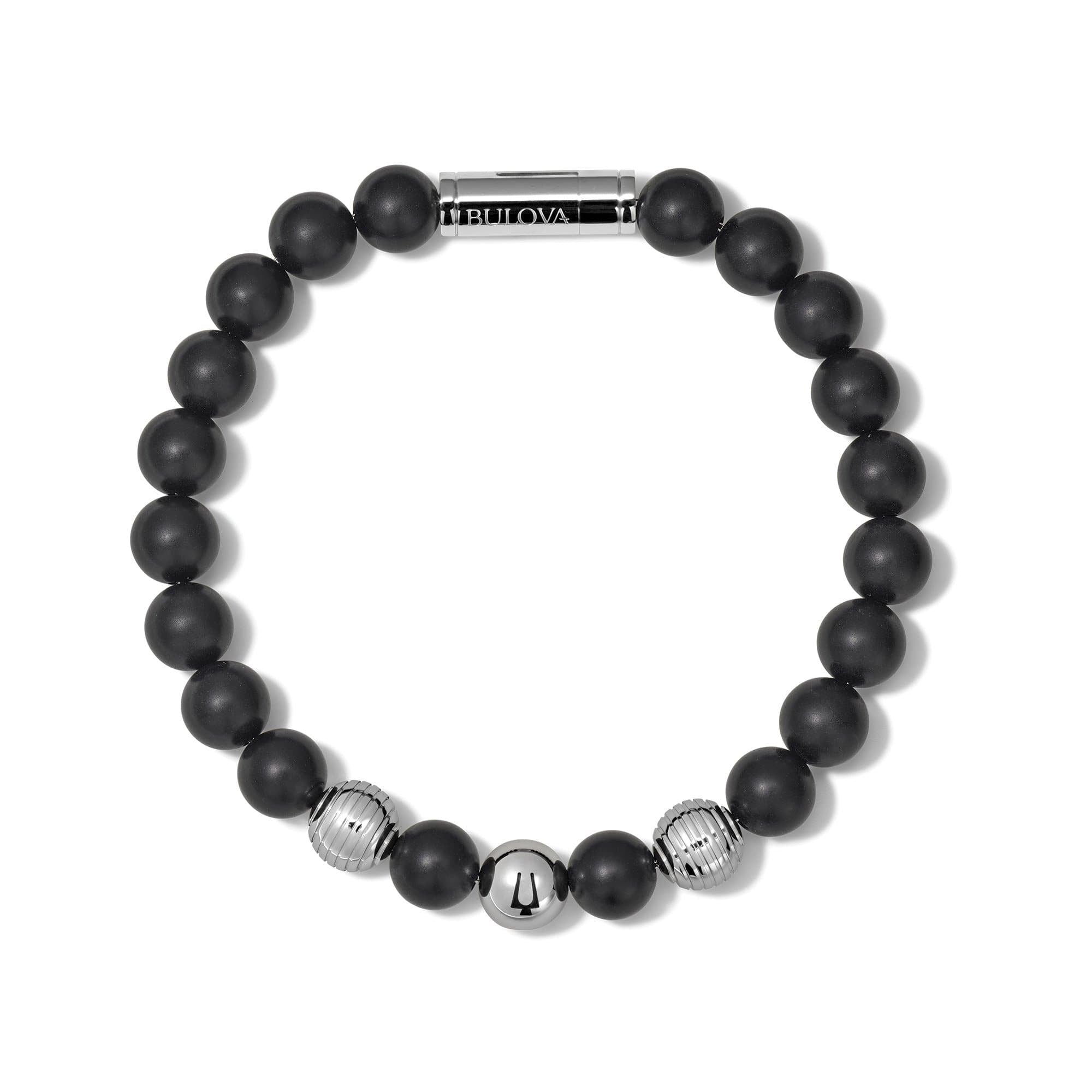 Bead bracelet features semi-precious matte black onyx, believed to promote physical strength and stamina, accentuated by contrasting stainless steel disks and spheres. Center bead features Bulova’s signature tuning fork logo. Magnetic stainless steel cylinder clasp makes styling effortless. 8mm beads.