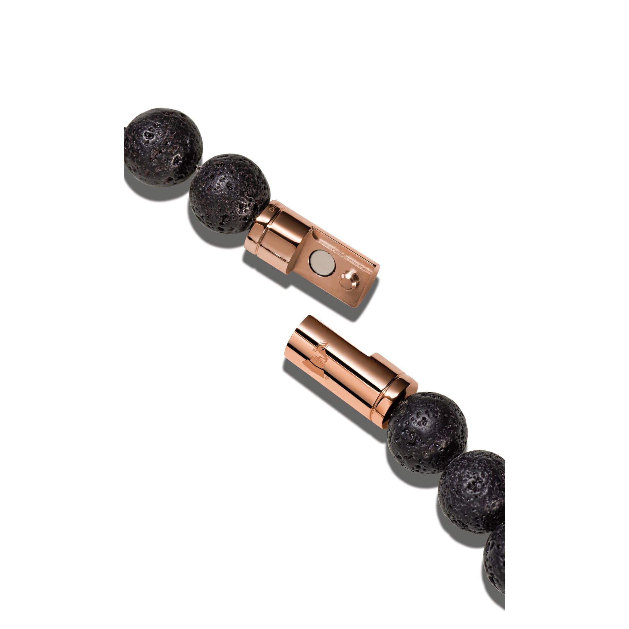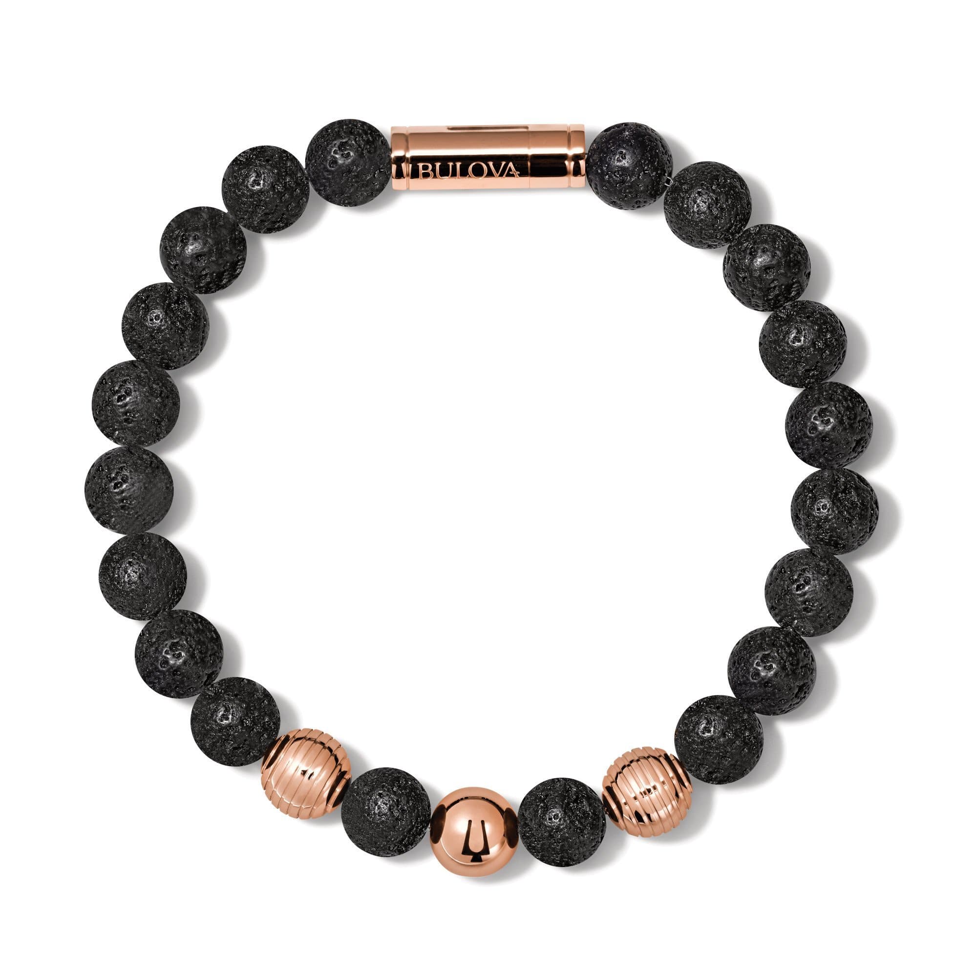 Bead bracelet features semi-precious matte black onyx, believed to promote physical strength and stamina, accentuated by contrasting rose gold-tone disks and spheres. Center bead features Bulova’s signature tuning fork logo. Magnetic rose gold-tone stainless steel cylinder clasp accented with the Latin GRAMMY® logo makes styling effortless.