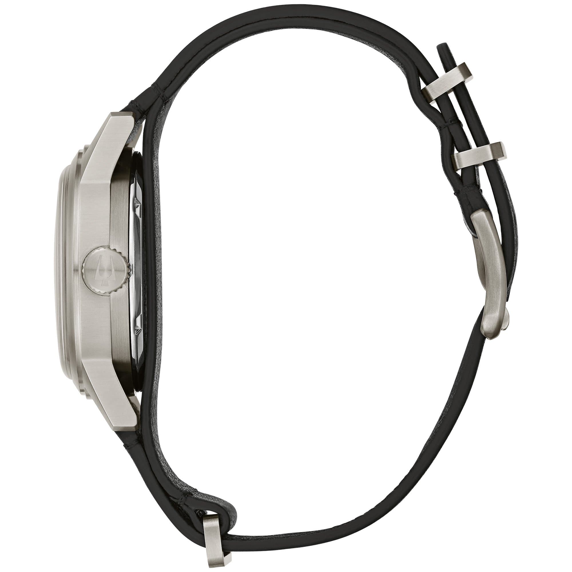 Inspired by Bulova’s military heritage and vintage watches of the time, the Hack Watch infuses historical elements for a contemporary lifestyle. The updated style features a three-hand 21-jewel automatic movement with a 42 hour power reserve. The stainless steel case with an ivory dial and luminescent hands and markers also features a center track on the dial displaying 24H time. Black leather NATO strap. Domed mineral crystal. Water resistance to 30 meters.