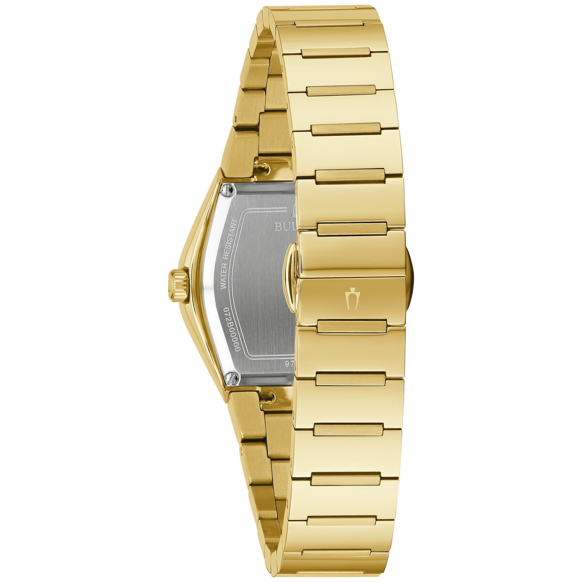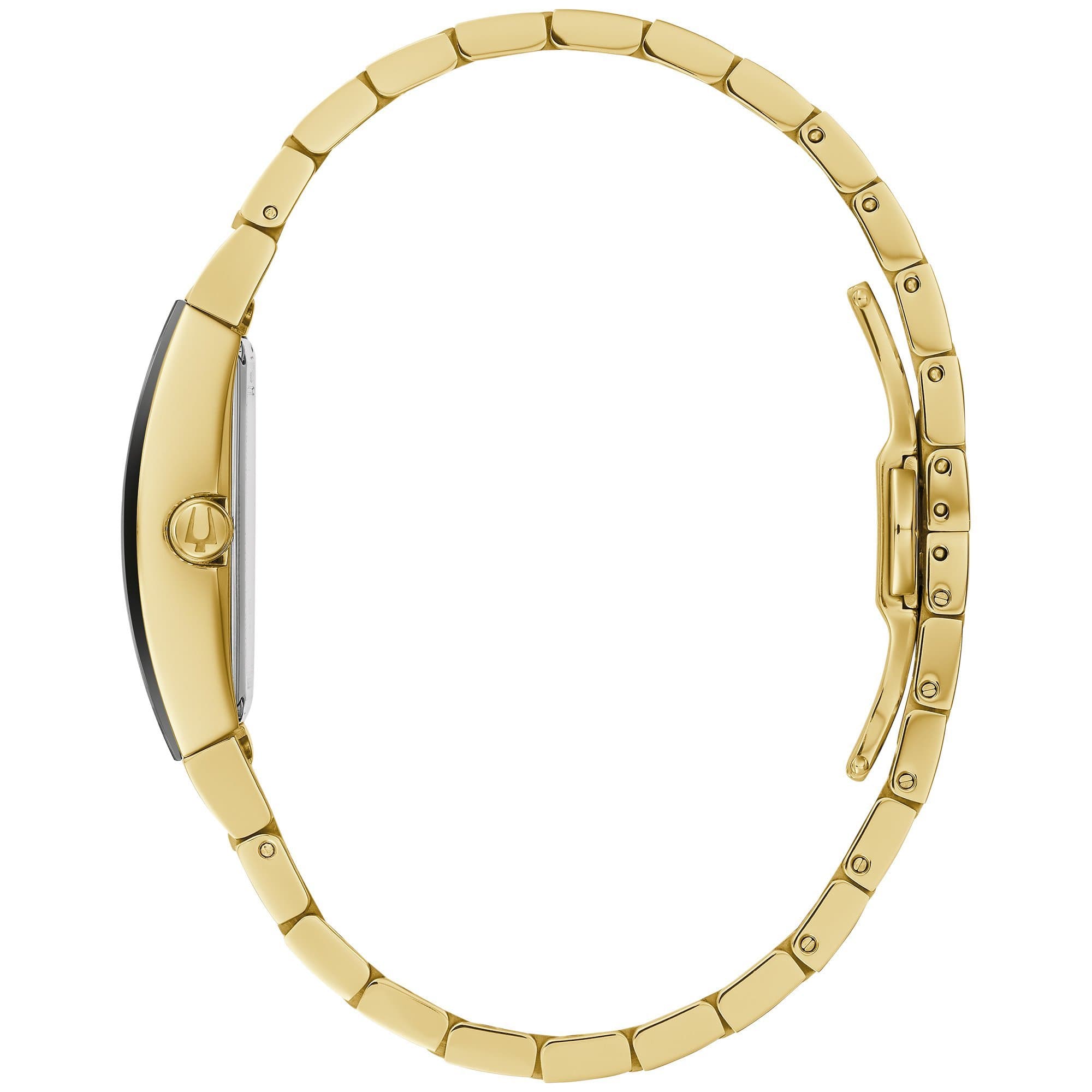 Distinctive asymmetrical tonneau shaped gold-tone stainless steel case with a black signature Futuro edge to edge curved metalized crystal features a black dial with gold-tone accents, and a gold-tone stainless steel bracelet. The watch features a three-hand quartz movement, deployant buckle with pushers, and water resistance to 30 meters.
