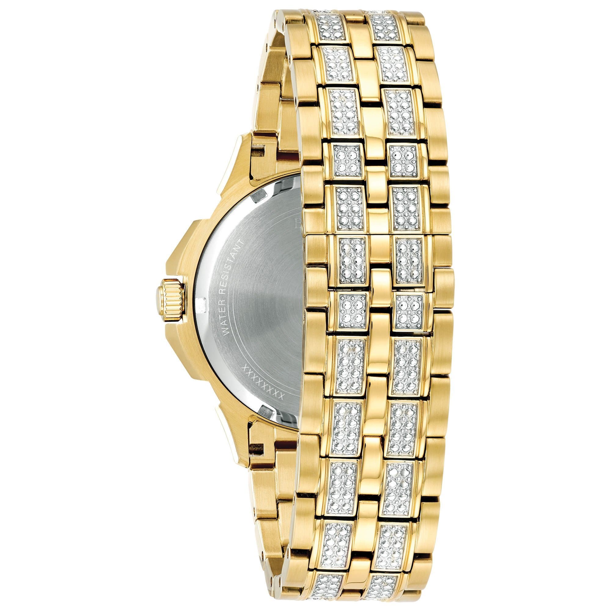 From the Men's Crystal Collection. Gold-tone stainless steel case embellished with 308 Swarovski® Crystals on bezel, bracelet and pav© dial, multifunction movement, gold-tone stainless bracelet with deployment closure, and water resistance to 30 meters.