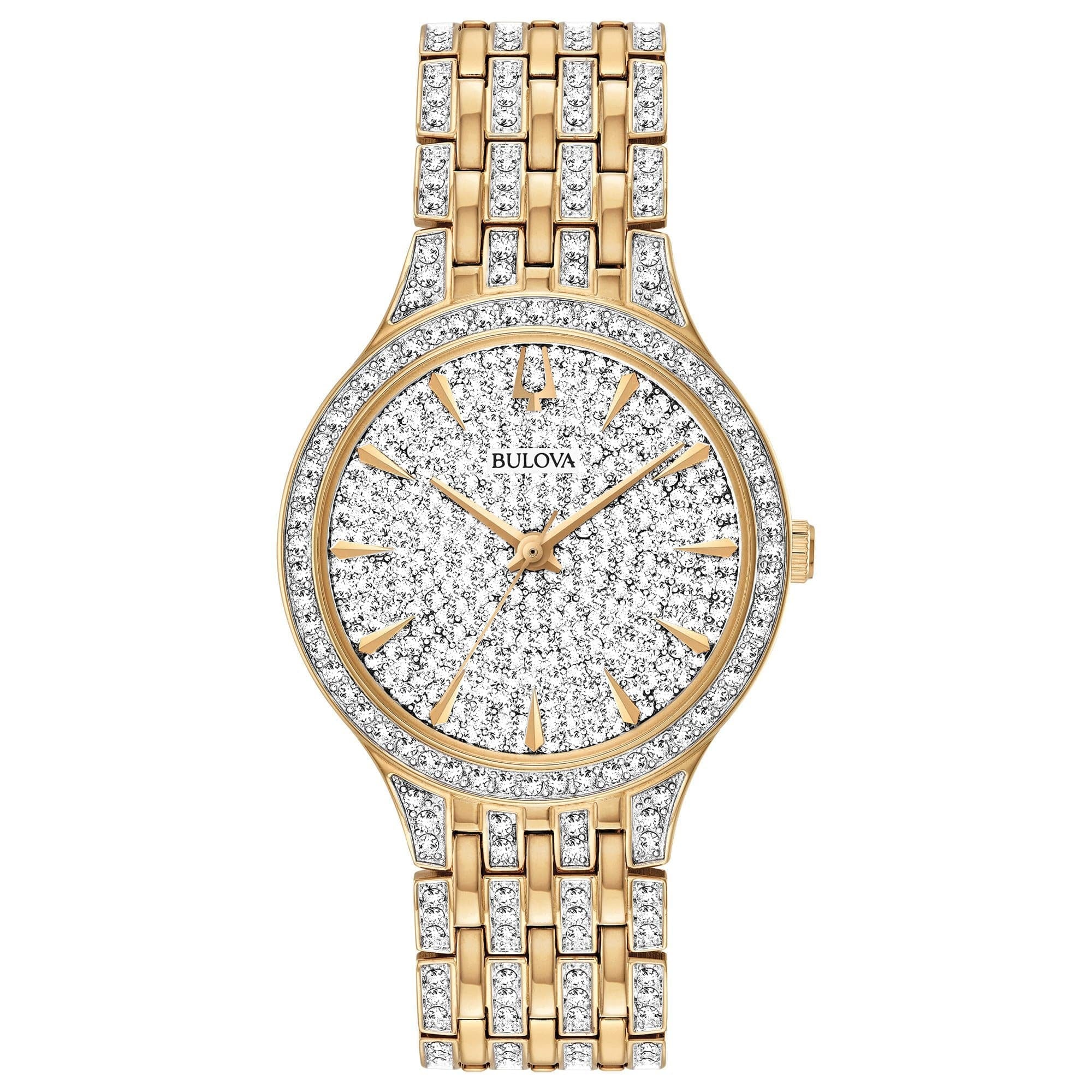 Bulova Phantom watch embellished with 440 Swarovski® Crystals. Gold and silver tone stainless steel case and bracelet and clear pave dial.