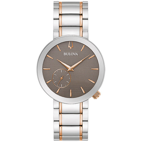This new Bulova ladies’ timepiece adds to the Latin GRAMMY® Collection and continues the brand’s celebration of the awards show and the remarkable artists that make it possible. An edge-to-edge, curved metalized sapphire crystal creates an exceptionally modern 35mm case, which features silver-tone stainless steel and a rose gold-tone crown. The textured dial is accented with rose gold-tone hands and markers and a sweep seconds sub-dial. On the back of the watch, the screw-back case is stamped with Latin GRAMMY® logo. The watch is paired perfectly with a matching two-tone bracelet with a deployant clasp. Bring the spirit of the Latin GRAMMY® awards and its incredible artists with this new Bulova ladies’ timepiece.