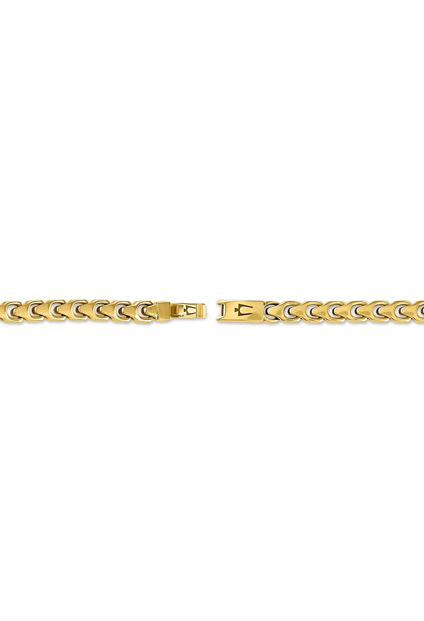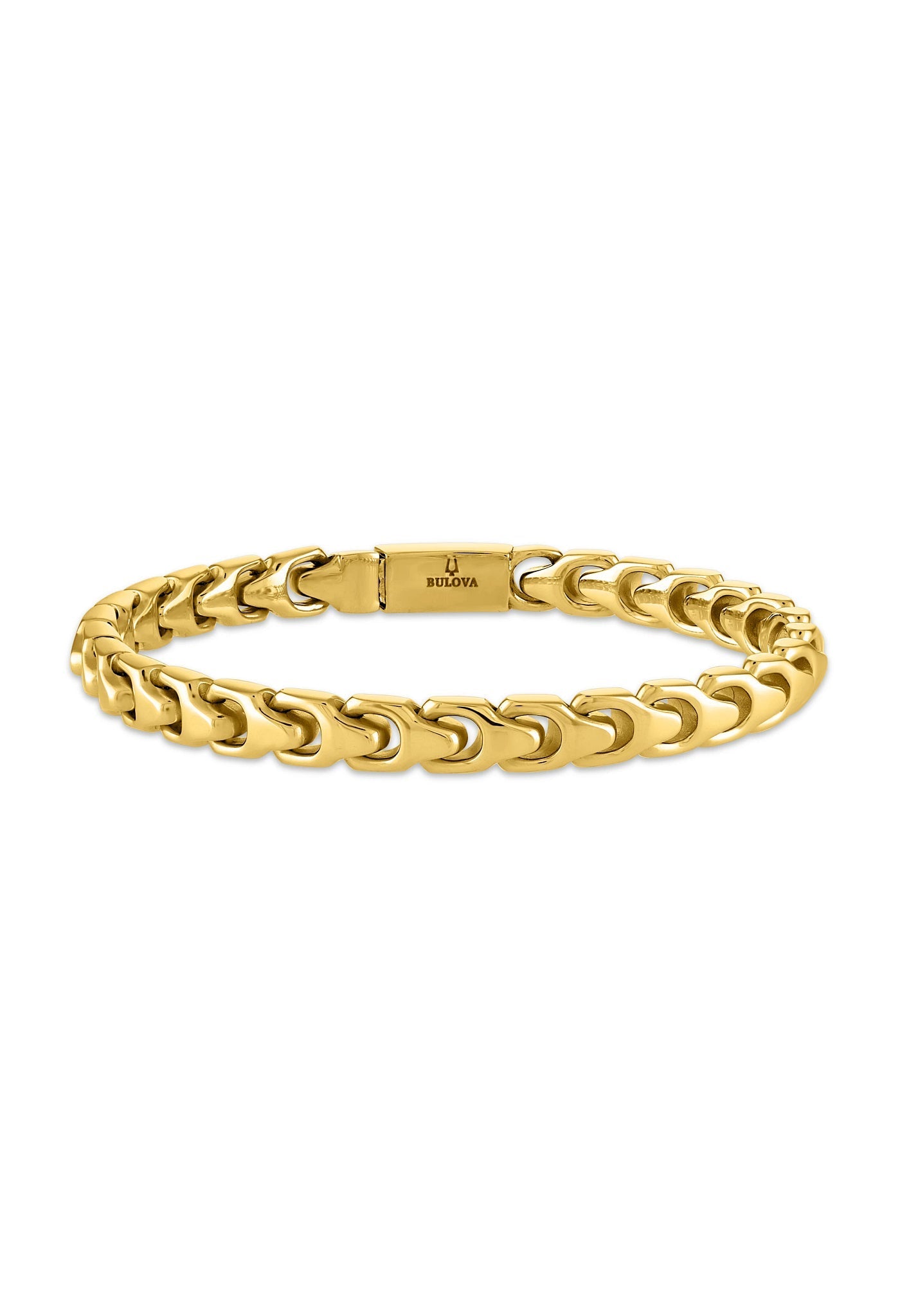The fresh new Bulova Link™ Collection abounds in both personality and presence as our iconic tuning fork makes its debut as a signature design element. Destined to become a classic, this sleek and stylish 6MM gold-tone stainless steel bracelet makes a bold statement. Measures 8.5" in length and features a box lock clasp etched with Bulova's iconic logo.