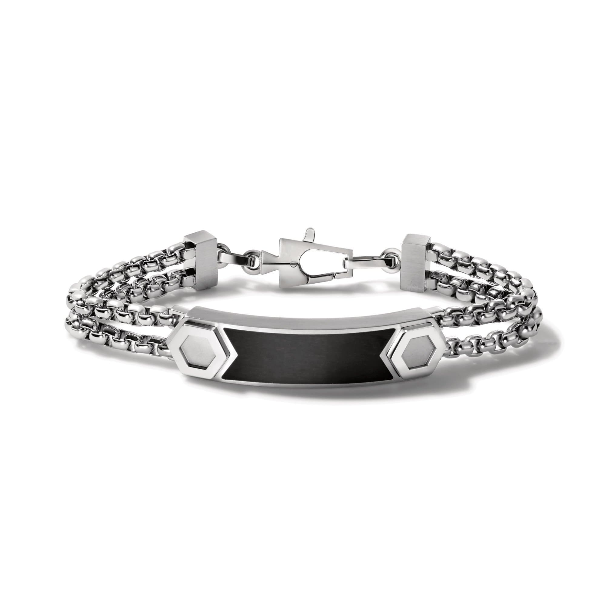 This contemporary double-chain ID bracelet in stainless steel secures with a Bulova signature tuning fork. Accented by iconic Precisionist bolt details and curved ID plaque with matte black epoxy inlay gives this piece unique character.