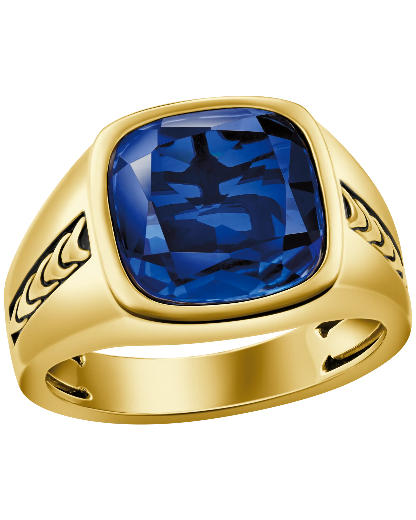 Statement ring in polished 14K gold-plated sterling silver features a faceted center stone of lab-created sapphire, a symbol of durability said to bring luck, loyalty and happiness. Bulova's signature tuning forks are featured in a vertical row on both sides as well as on the interior design. Center stone measures 12MM x 12MM. Size 10.