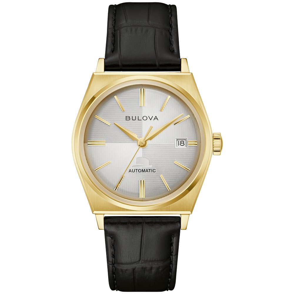 Inspired by the classic 1967 Bulova Banker watch, this Bulova Frank Sinatra men’s timepiece keeps things cool with upscale, vintage styling. The luxurious design and finishing garner this watch the “Nothing But The Best” moniker, the gold-tone stainless steel case showing off its dual finishing and unique shape while an alligator-pattern leather strap adds a perfect complement. Under a boxed sapphire crystal, the silver-white dial captures the heart like Sinatra’s melodies, with alternating textured lines creating depth and gold-tone hands keeping the beat as Sinatra’s signature fedora is subtly pressed at 6 o’clock. The automatic movement is visible through a caseback crystal emblazoned with Sinatra’s fedora and signature, and it delivers 42 hours of power on a full wind. Capture the spirit and style of Sinatra’s legendary charm with this Bulova men’s watch.