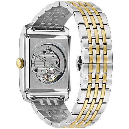 From the Sutton Collection, this new men’s Bulova timepiece delivers sophisticated style with a mechanical heart. The refined rectangular two-tone stainless steel case features a silver-tone body and a gold-tone frame around a curved mineral crystal. A textured silver white dial is appointed with gold-tone Arabic numerals with matching hands. At 7 o’clock, a framed aperture offers a view of the beating heart of the watch, the 21-jewel mechanical movement which has a power reserve of 42 hours. A matching five-link bracelet features a deployant closure with pushers for a seamless fit. Richly embellished and exquisitely designed, this new Bulova men’s timepiece is a smart companion for the stylish gentleman.