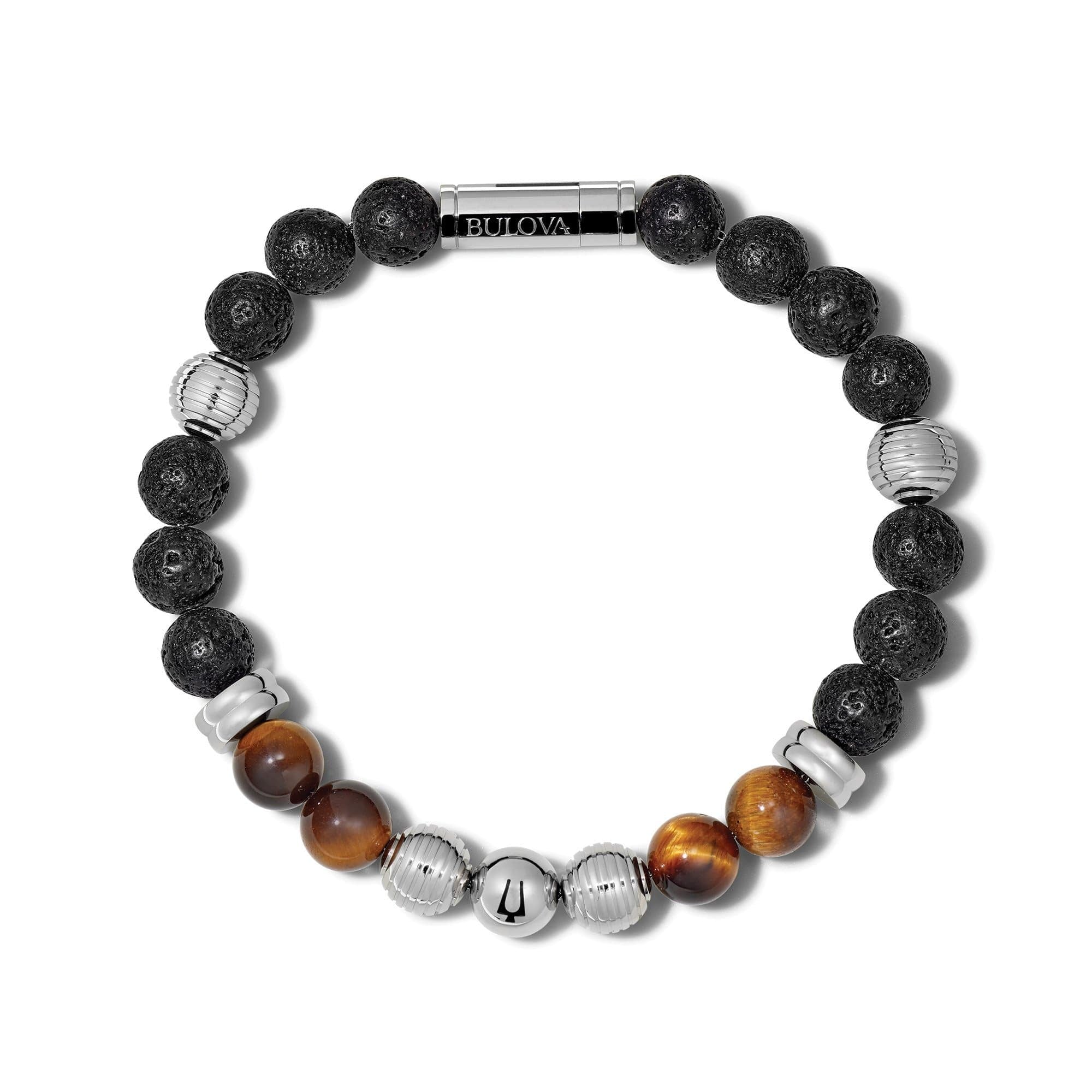 Bead bracelet features semi-precious tiger’s eye, believed to bring good luck and prosperity, accentuated by contrasting stainless steel disks and spheres, and black lava beads, reputed to impart calmness and strength. Center bead features Bulova’s signature tuning fork logo. Magnetic stainless steel cylinder clasp makes styling effortless. 8mm beads.