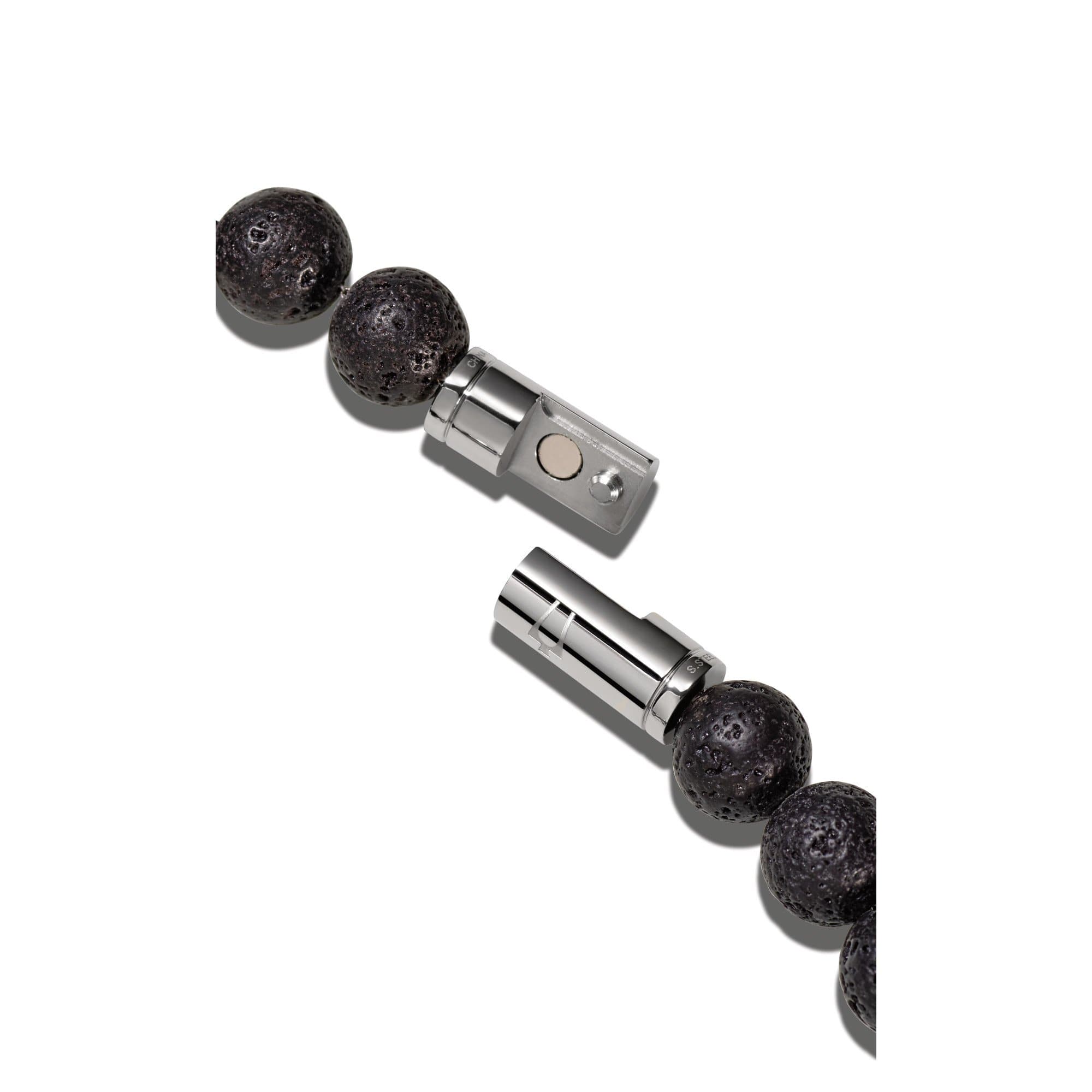 Bead bracelet features semi-precious tiger’s eye, believed to bring good luck and prosperity, accentuated by contrasting stainless steel disks and spheres, and black lava beads, reputed to impart calmness and strength. Center bead features Bulova’s signature tuning fork logo. Magnetic stainless steel cylinder clasp makes styling effortless. 8mm beads.