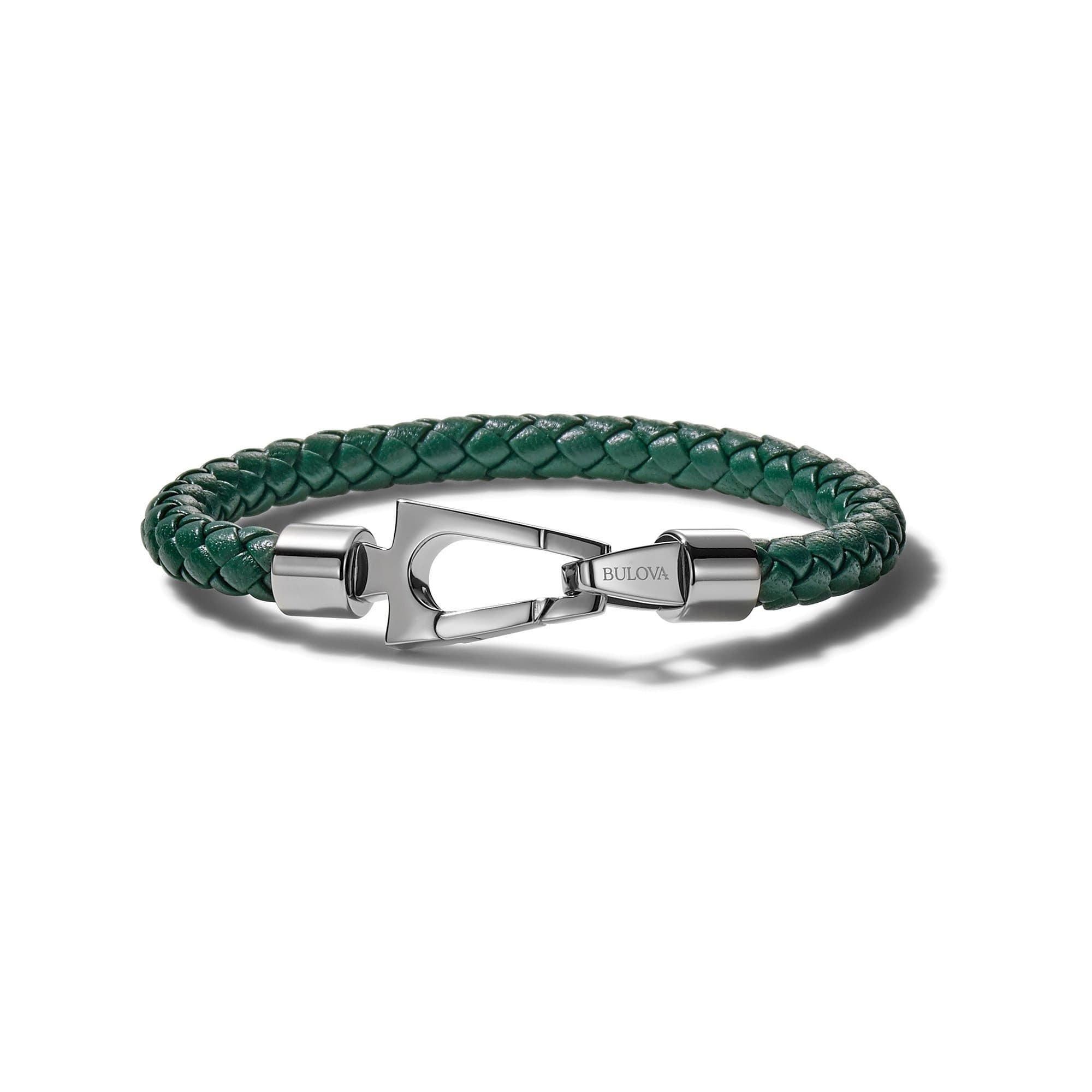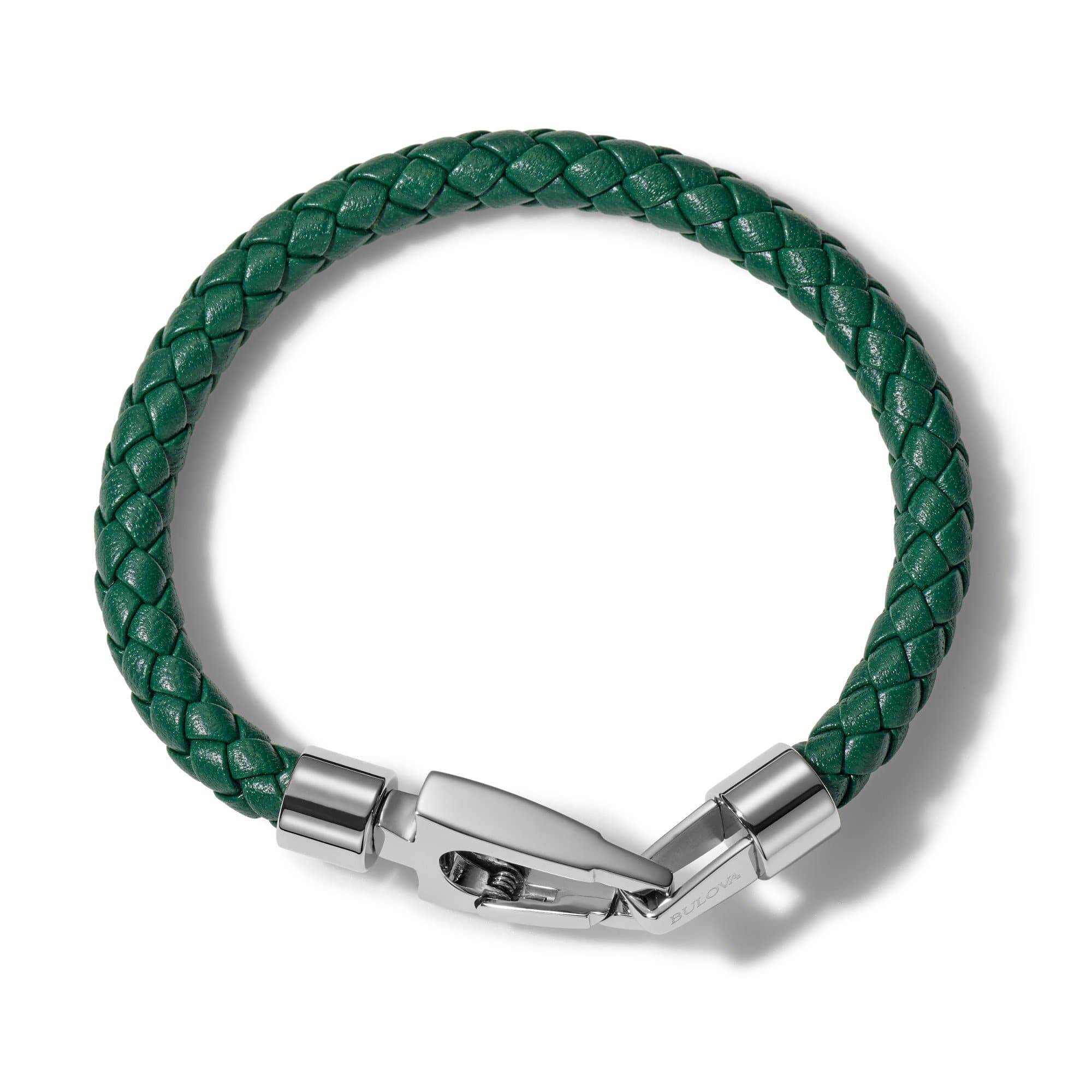 Inspired by nautical ropes and color codes, this braided leather bracelet in cool green offers endless layering possibilities. The bracelet is anchored by a stainless steel signature tuning fork clasp.