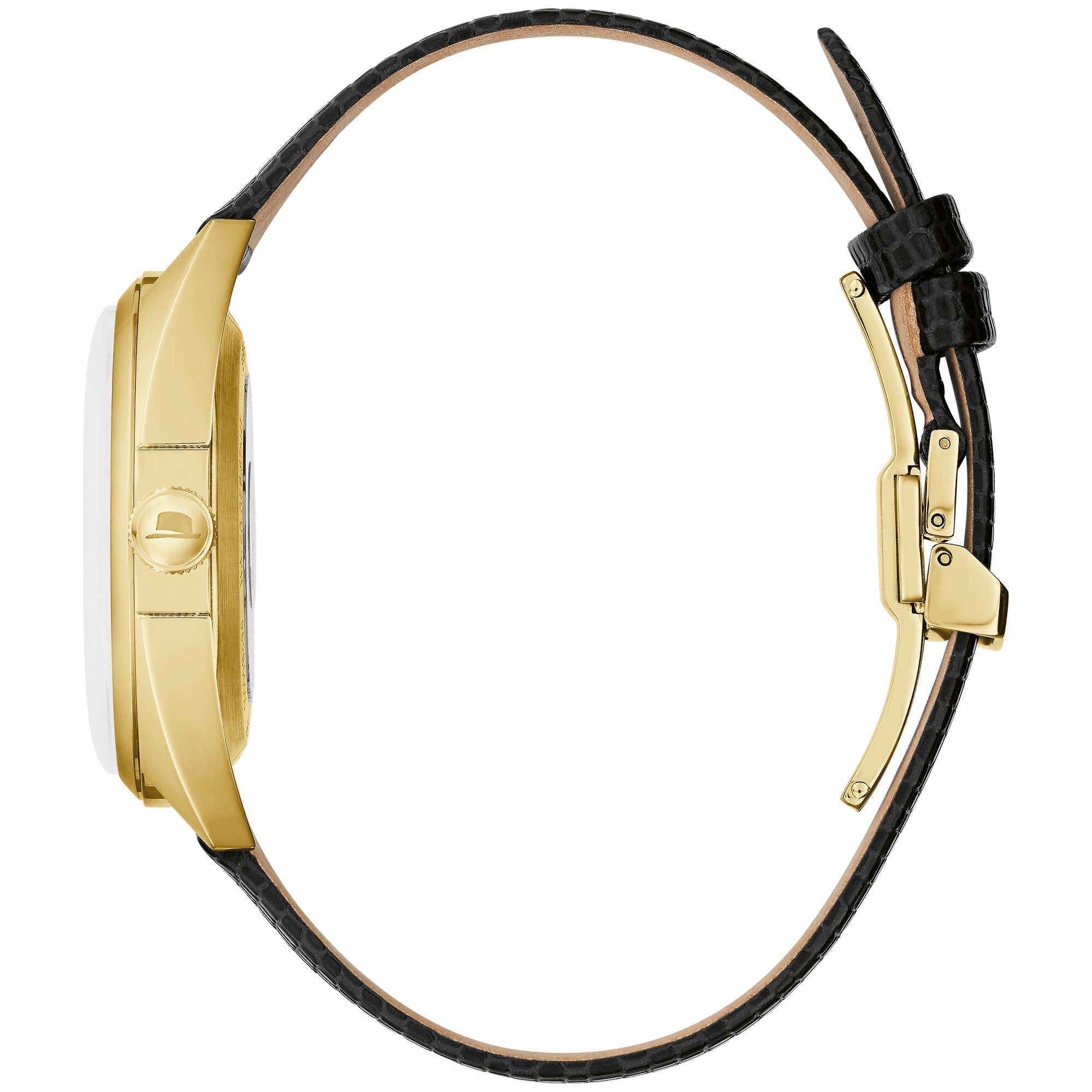 Incorporating vintage Bulova designs with the unmistakable elements of legendary performer, Frank Sinatra, the ‘Fly Me To The Moon’ watch features a gold-tone stainless steel case with gold-tone vintage style hands and markers. Frank Sinatra’s signature is displayed elegantly on the textured silver white dial. The watch features a Miyota Caliber 8215 21-jewel automatic movement with a 42-hour power reserve and calendar. The exhibition case back showcases the fine movement and features the song title as well as the iconic Fedora Hat, which can also be found etched on the crown. The black lizard grain textured leather strap features a deployant buckle and is stamped with the name ‘Fly Me To The Moon’ along the inside. The watch features a domed sapphire crystal with AR coating and water resistance to 30 meters.
