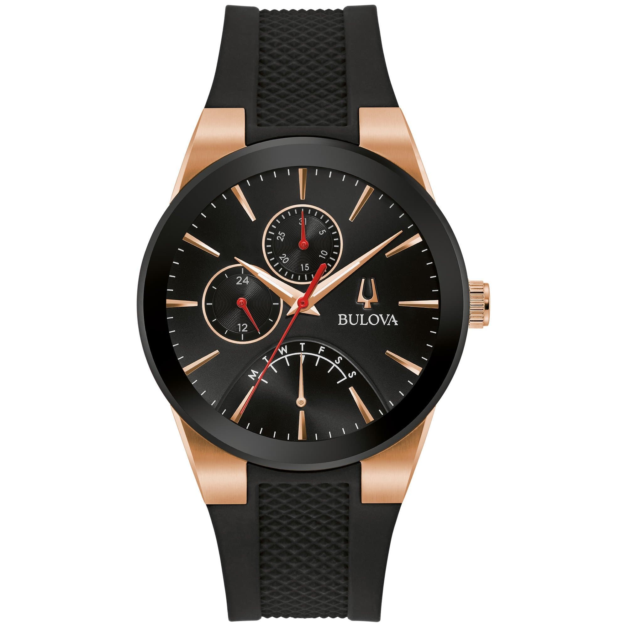 Bulova Futuro watch rose gold-tone stainless steel screw-back case with black metalized crystal and a rose gold-tone crown. Black six-hand multi-function dial with day, date. and 24-hour features and rose gold-tone accents with a red second hand, domed mi