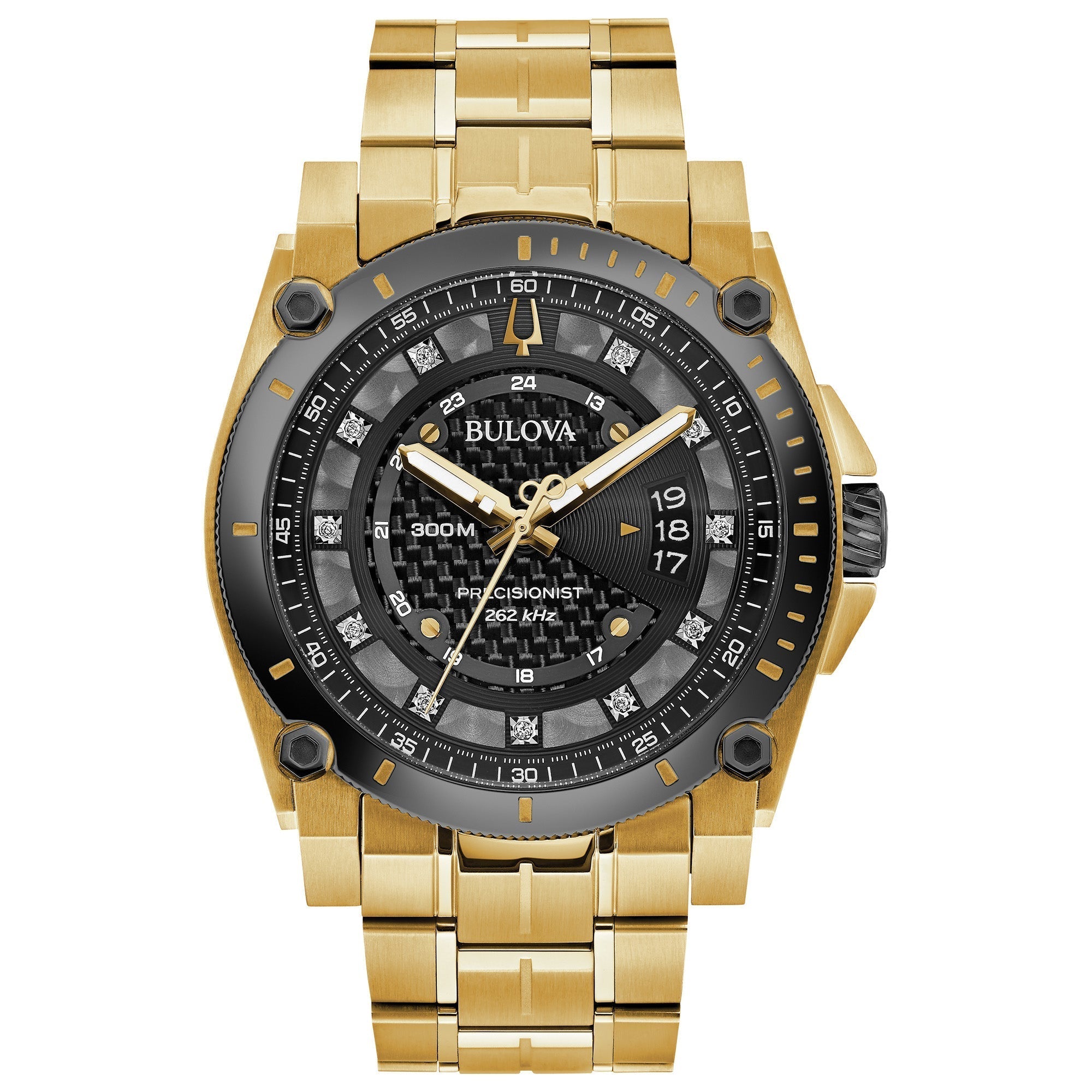 Powered by Bulova’s proprietary Precisionist three-hand calendar movement with a 262kHz vibrational frequency—eight times greater than standard timepieces—for unparalleled accuracy. Gold-tone stainless steel case with black dial featuring 11 hand set diamonds, curved mineral crystal, gold-tone stainless steel bracelet with sport fold over buckle. 300-meter water resistance.