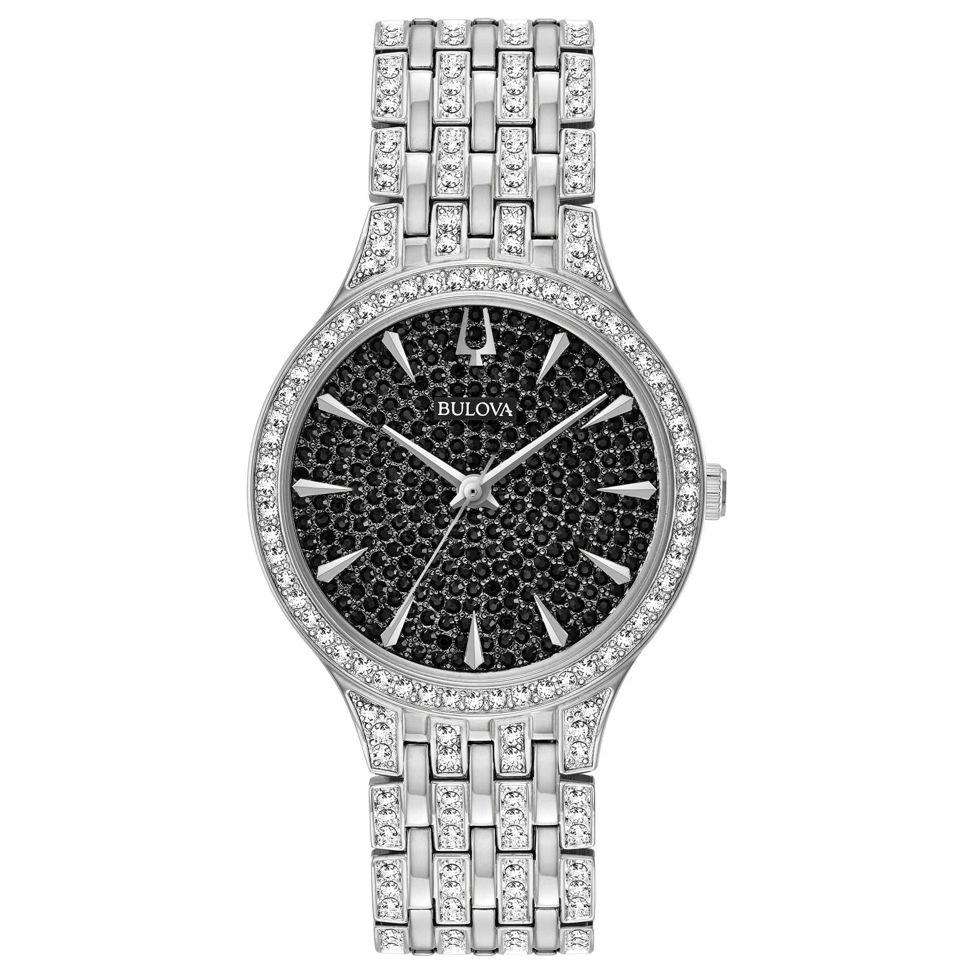 New slim and sleek style embellished with 440 Swarovski® Crystals. Silver tone stainless steel case and bracelet and black pave dial. Watch features a flat mineral crystal, quartz movement, and water resistance to 30 meters. Water resistance to 30 meters.