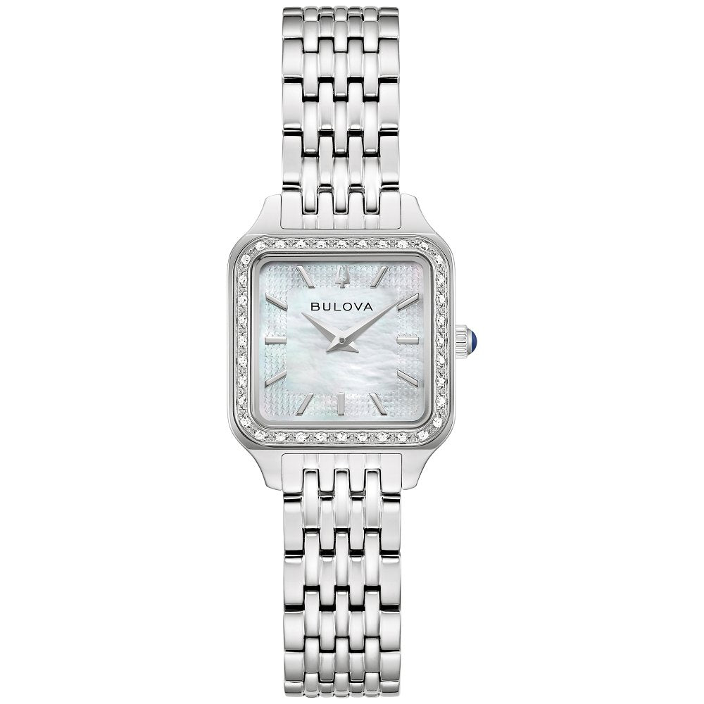 Timeless design meets modern flair with the Bulova ladies’ Classic Sutton Square. A graceful accent to any ensemble, the petite silver-tone stainless steel case has a soft square silhouette with a gem-set bezel with 36 1mm sparkling diamonds and a crown set with a blue cabochon. White mother-of-pearl provides an iridescent foundation for the time, which is indicated by polished dauphine hands and applied hour markers set upon an engaging translucent pattern. With a matching seven-row bracelet, this Bulova women’s timepiece is an essential part of every wardrobe.