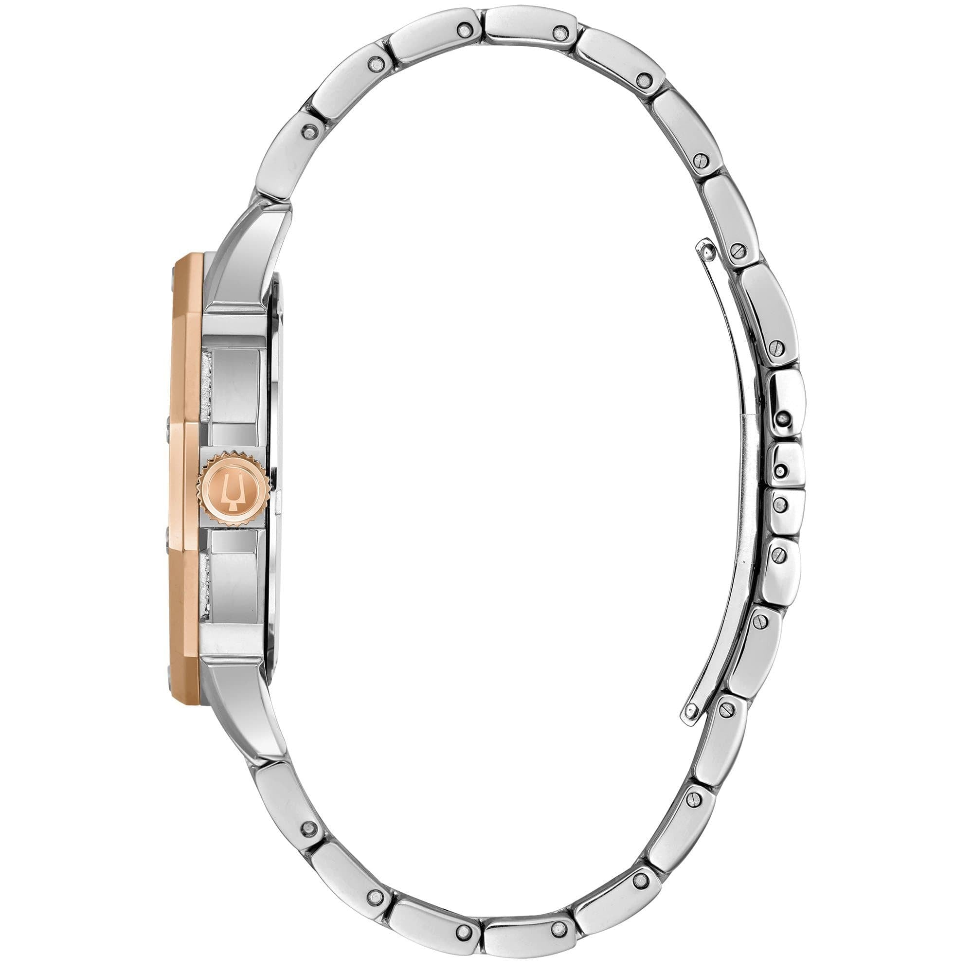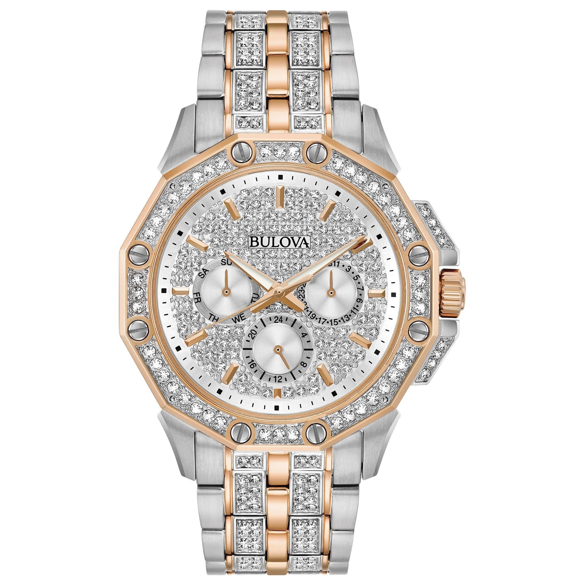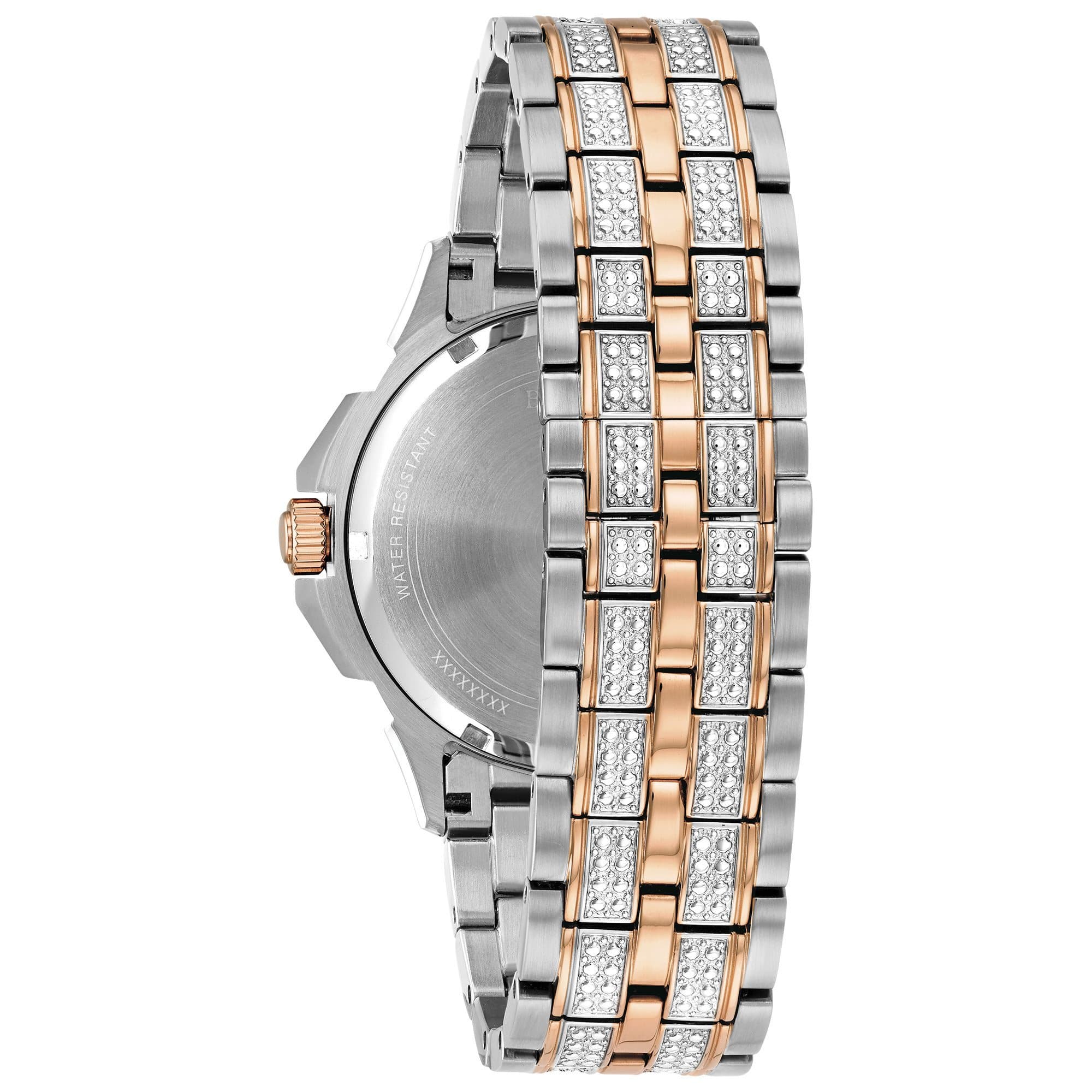 Multi-function dress watch boldly embellished with 300 Swarovski® Crystals on the two tone silver and rose gold tone stainless steel case and bracelet with a pave set silver white dial. Water resistance to 30 meters.